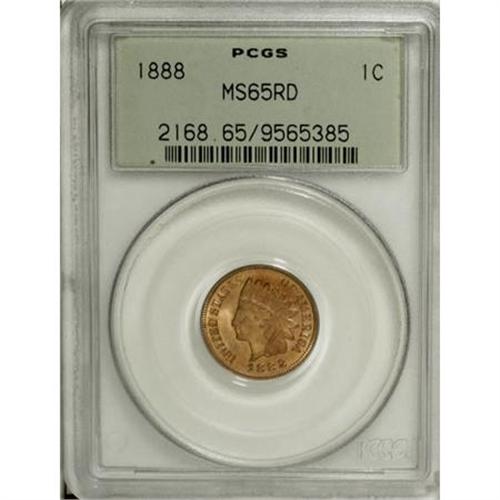 <B>1888 1C MS65 Red PCGS.</B></I> The luminous peach-red surfaces are supremely lustrous and display generally bold striking detail--allowing for some typical weakness on Liberty's hair and headdress feather tips, and on the wreath's ribbon bow. Nicely preserved with a few small marks and scattered carbon flecks on each side. Minor clash marks are noted in the reverse fields. Population: 29 in 65 Red, 13 finer (7/07). <I>From The Santa Fe Collection.</B></I><BR><BR><B>Coin Engraver:</B> James B. Longacre<BR><BR><b>Shipping:</b> Coins & Currency (<a target="_blank" href="http://www.heritageauctions.com/common/shipping.php">view shipping information</a>\)