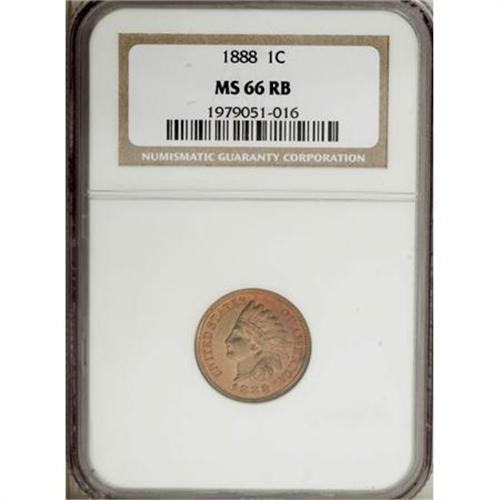 <B>1888 1C MS66 Red and Brown NGC.</B></I> Beautiful copper-gold luster displays a blush or two of crimson, and the design elements reveal exquisite detail. A couple of tiny gray-green spots are not bothersome. This Premium Gem looks to be full Red. Census: 7 in 66 Red and Brown, 0 finer (12/07).<BR><BR><B>Coin Engraver:</B> James B. Longacre<BR><BR><b>Shipping:</b> Coins & Currency (<a target="_blank" href="http://www.heritageauctions.com/common/shipping.php">view shipping information</a>)