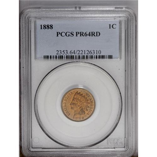<B>1888<1C> PR64 Red PCGS.</B></I> The color is even on both sides and attractive, however there are scattered carbon specks on both sides that limit the grade. Clean surfaces otherwise, and the usual strike anticipated for a proof. <BR><BR><B>Important notice:</B> Heritage usually auctions material at the rate of 200-250 lots per hour. On some occasions eBay Live bid software or the Internet may not be able to keep up with the pace of the auction. We recommend placing a realistic absentee bid now as insurance to avoid disappointment. Occasionally the auctioneer may eliminate or reject an eBay Live bid, and the auctioneer may also reopen a lot after the close of the eBay live bidding (usually because we missed an audience bid), and may reject your bid even if it shows you as the winning bidder. By bidding via eBay Live, you agree that Heritage may award the lot to another bidder at its sole discretion under the circumstances described above or any other reasonable circumstances. Since eBay bids are not shown to us until we open the lot on the floor, we treat those bids just like floor bids. In most cases the floor responds before the eBay bid is presented to us, due to Internet lag time, so for consistency we have made it a policy that floor bids are always considered first over tie eBay live bids. Also please note that all Heritage lots purchased through eBay Live carry a 20% Buyer's Premium. Please make sure you read the Terms and Conditions before you bid. This lot is being auctioned in conjunction with a live floor auction by Heritage Galleries & Auctioneers. All final auction and invoice information will be supplied by Heritage Galleries & Auctioneers, and all other information should be considered preliminary. Lot:454 <BR><BR><B>Winning Notification and Billing:</B> After the FINAL session in this auction is complete, Heritage will send e-mail and snail mail invoices. This process normally takes several days. All final auction and invoice information will be supplied by Heritage Galleries & Auctioneers, and all other information should be considered preliminary. <BR><BR>This auction will be conducted on a live auction floor and over the Internet through eBay Live. If you choose to place an absentee bid, please take a moment to <font color='#0000ff'><u><a href='http://pages.ebay.com/liveauctions/help/before/laabsentee.html'>learn how eBay Live absentee bidding works</a></u></font><font color='#000000'>