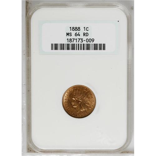 <B>1888 1C MS64 Red NGC.</B></I> The surfaces range from straw-gold to deep reddish-orange. What appears to be an abrasion on the cheek is actually raised, likely the result of a die gouge. Housed in a green label holder.<BR><BR><b>Shipping:</b> Coin/Currency (<a target="_blank" href="http://www.heritageauctions.com/common/shipping.php">view shipping information</a>) <BR><BR><B>I