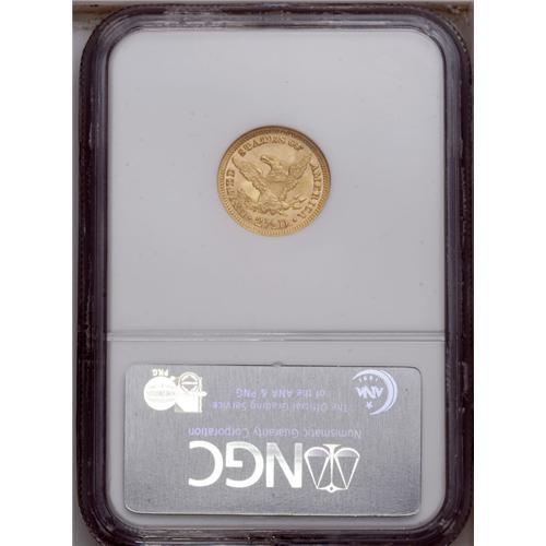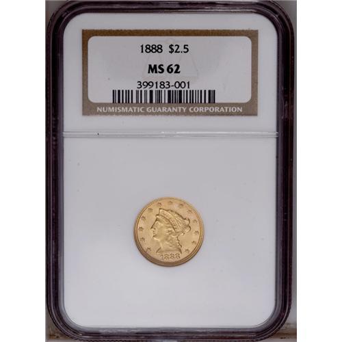 <B>1888<$2 1/2> MS62 NGC.</B></I> A hint of striking softness in the centers, but the stars, legends, and dentils are sharp. A lustrous canary-gold example of this low mintage quarter eagle issue. Just 16,001 pieces were struck.