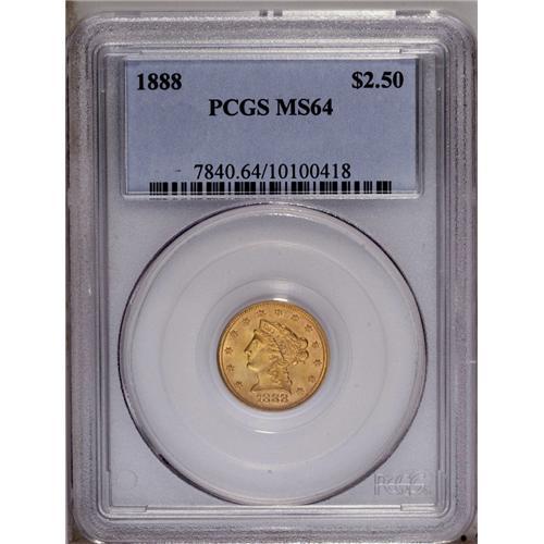 <B>1888<$2 1/2> MS64 PCGS.</B></I> A crisply struck near-Gem with shimmering luster and clean surfaces. The mintage of 16,000 pieces ensures the scarcity of this issue. Population: 33 in 64, 10 finer (3/06).