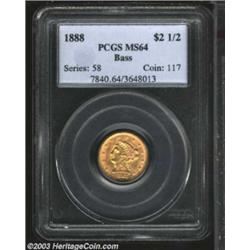 <TABLE cellSpacing=0 cellPadding=0 width="100%" bgColor=#000000 border=0><TBODY><TR><TD width="100%"><TABLE cellSpacing=1 cellPadding=3 width="100%" border=0><TBODY><TR><TD width="100%" bgColor=#79735c><FONT face=arial color=#ffffff size=3><B>Description</B> </FONT></TD></TR><TR><TD width="100%" bgColor=#ffffff><FONT face=arial size=2><B>1888 $2 1/2 MS64 PCGS.</B></I> A crisply struck near-Gem with shimmering luster and clean surfaces. The mintage of 16,000 pieces ensures the scarcity of this issue. Population: 27 in 64, 5 finer (8/03).<BR><I>Ex: Harry W. Bass, Jr. Collection, Part IV (Bowers and Merena, 11/2000), lot 250, where it realized $1,380. Purchased from Dan Brown, 10/18/1966.</B></I> </FONT></TD></TR></TBODY></TABLE></TD></TR></TBODY></TABLE><BR><A name=PricesRealized></A><TABLE cellSpacing=0 cellPadding=0 width="100%" bgColor=#000000 border=0><TBODY><TR><TD width="100%"><TABLE cellSpacing=1 cellPadding=3 width="100%" border=0><TBODY><TR><TD width="100%" bgColor=#79735c><A name=PR><FONT face=arial color=#ffffff size=3><B>Previous Prices from Heritage Auctions</B> </FONT></A></TD></TR><TR><TD bgColor=#f6f6ed><TABLE cellSpacing=0 cellPadding=0 width="100%" border=1><TBODY><TR><TD align=middle width="33%"><B>Date</B></TD><TD align=middle width="33%"><B>Service</B></TD><TD align=middle width="33%"><B>Price</B></TD></TR><TR bgColor=whitesmoke><TD width="33%"><B>11/25/2002</B></TD><TD width="33%">PCGS</TD><TD width="33%">$1,207.50</TD></TR><TR bgColor=whitesmoke><TD width="33%"><B>01/05/2001</B></TD><TD width="33%">PCGS</TD><TD width="33%">$1,495.00</TD></TR><TR bgColor=whitesmoke><TD width="33%"><B>02/01/1999</B></TD><TD width="33%">PCGS</TD><TD width="33%">$1,072.00</TD></TR><TR bgColor=whitesmoke><TD width="33%"><B>04/15/2003</B></TD><TD width="33%">PCGS</TD><TD width="33%">$1,380.00</TD></TR></TBODY></TABLE></TD></TR><TR><TD bgColor=#ffffff><FONT face=arial size=1 ?>PLEASE NOTE: All prices realized reflect the final hammer price PLUS the buyer's premium in auctions that charge a buyer's premium. Each item has a notation at the top of the listing indicating whether that lot included a buyer's premium. Example: A item that sells with a final hammer price of $100 and a 20% buyer's premium will display with a price realized of $120. All information listed is intended to be as accurate as possible, but errors are possible. Please use this guide carefully and inform us of any inaccuracies. </FONT></TD></TR></TBODY></TABLE></TD></TR></TBODY></TABLE><BR><TABLE cellSpacing=0 cellPadding=0 width="100%" bgColor=#000000 border=0><TBODY><TR><TD width="100%"><TABLE cellSpacing=1 cellPadding=3 width="100%" border=0><TBODY><TR><TD width="100%" bgColor=#79735c colSpan=6><FONT face=arial color=#ffffff size=3><B>Price Guide*</B> </FONT></TD></TR><TR bgColor=#f6f6ed><TD align=middle><B>Grade</B> </TD><TD align=middle><B>Coin World<BR>(Trends)</B> </TD><TD align=middle><B>Numismedia<BR>Retail</B> </TD><TD align=middle><B>Numismedia<BR>Wholesale</B> </TD><TD align=middle><B>Coin<BR>Universe</B> </TD><TD align=middle><B>Heritage<BR>Value Index</B> </TD></TR><TR bgColor=#ffffff><TD align=middle>63</TD><TD align=right>$875.00</TD><TD align=right>$860.00</TD><TD align=right>$685.00</TD><TD align=right>$910.00</TD><TD align=right>$646.50</TD></TR><TR style="FONT-WEIGHT: bold" bgColor=#cccfdd><TD align=middle>64</TD><TD align=right>$2,000.00</TD><TD align=right>---</TD><TD align=right>$1,500.00</TD><TD align=right>$1,700.00</TD><TD align=right>$1,211.88</TD></TR><TR bgColor=#ffffff><TD align=middle>65</TD><TD align=right>---</TD><TD align=right>---</TD><TD align=right>$5,375.00</TD><TD align=right>$7,900.00</TD><TD align=right>$4,902.50</TD></TR><TR bgColor=#ffffff><TD colSpan=6><FONT size=1>*All information listed is intended to be as accurate as possible, but errors are possible. No item may be returned or refused based on this information which is provided as a service to our customers. You should contact each pricing source directly to determine the accuracy of this information. </FONT></TD></TR></TBODY></TABLE></TD></TR></TBODY></TABLE><BR><TABLE cellSpacing=0 cellPadding=0 width="100%" bgColor=#000000 border=0><TBODY><TR><TD width="100%"><TABLE cellSpacing=1 cellPadding=3 width="100%" border=0><TBODY><TR><TD width="100%" bgColor=#79735c><FONT face=arial color=#ffffff size=3><B>Population Guide</B> </FONT></TD></TR><TR bgColor=#ffffff><TD align=middle><!-- Begin Output of Population Grid--><TABLE cellSpacing=0 cellPadding=0 width="100%" border=0><TBODY><TR><TD vAlign=center><TABLE cellSpacing=0 width="100%" border=1 cellsadding="3"><TBODY><TR><TD vAlign=center><TABLE cellSpacing=0 cellPadding=3 width="100%" border=1><TBODY><TR><TD vAlign=center align=middle bgColor=#f0f1e8 colSpan=2 <CENTER><FONT face=Arial size=2><B>PCGS Pop </B></FONT><CENTER></CENTER></TD><TD vAlign=center align=middle bgColor=#f0f1e8 colSpan=2><CENTER><FONT face=Arial size=2><B>NGC Pop</B></CENTER></FONT></TD></TR><TR><TD vAlign=center><FONT face=Arial size=2>(64)</FONT> </TD><TD vAlign=center align=right><FONT face=Arial size=2>27</FONT> </TD><TD vAlign=center><FONT face=Arial size=2>(64)</FONT> </TD><TD vAlign=center align=right><FONT face=Arial size=2>35</FONT> </TD></TR><TR><TD vAlign=center><FONT face=Arial size=2>(>64)</FONT> </TD><TD vAlign=center align=right><FONT face=Arial size=2>5</FONT> </TD><TD vAlign=center><FONT face=Arial size=2>(>64)</FONT> </TD><TD vAlign=center align=right><FONT face=Arial size=2>9</FONT> </TD></TR></TBODY></TABLE></TD></TR></TBODY></TABLE></TD></TR></TBODY></TABLE><!-- End Output of Population Grid--> Important notice: Heritage usually auctions material at the rate of 200-250 lots per hour. On some occasions eBay Live bid software or the Internet may not be able to keep up with the pace of the auction. We recommend placing a realistic absentee bid now as insurance to avoid disappointment. Occasionally the auctioneer may eliminate or reject an eBay Live bid, and the auctioneer may also reopen a l