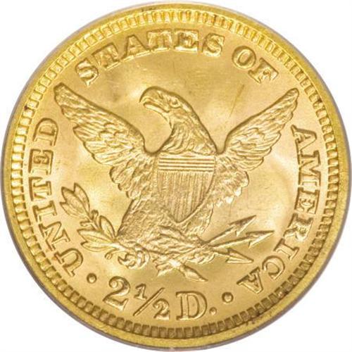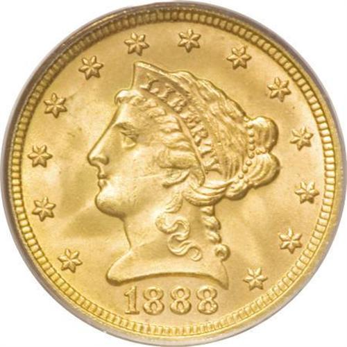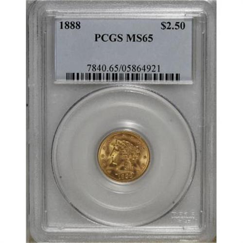 <B>1888 $2 1/2 MS65 PCGS.</B></I> This highly lustrous quarter eagle displays an effulgent, frosty sheen across both sides. The pleasing wheat-gold toning yields to copper-rose peripheral accents on each side. Softly struck in the centers, and on the eagle's right (facing) talons, but well preserved and free of any distracting marks or blemishes. "Gem Uncirculated coins of the date are quite rare," according to Jeff Garrett and Ron Guth (2006). Population: 12 in 65, 0 finer (3/08). <BR><BR><B>Coin Engraver:</B> Christian Gobrecht<BR><BR><b>Shipping:</b> Coins & Currency (<a target="_blank" href="http://www.heritageauctions.com/common/shipping.php">view shipping information</a>)
