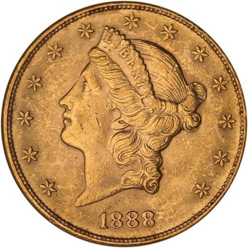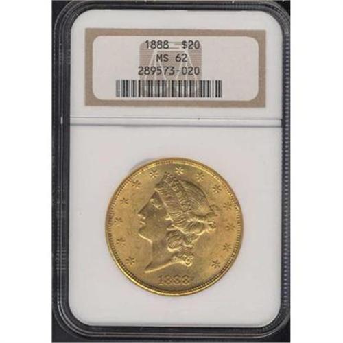 <b>1888 $20 Liberty. NGC graded MS62.</b> Heavy with golden frost from edge to edge there are the usual bagmarks on the face and neck, etc <b>(PCGS # 9008)</b> <i>