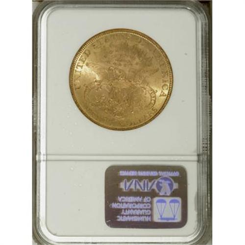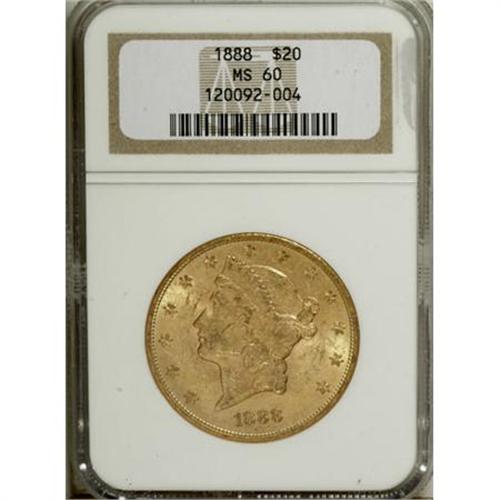 <B>1888 $20 MS60 NGC.</B></I> The 1888, while readily available in circulated grades, becomes elusive in Mint State. This luminous orange-gold example is well-defined and retains a measure of eye appeal despite a number of considerable abrasions.<BR><BR><B>Coin Engraver:</B> James B. Longacre<BR><BR><b>Shipping:</b> Coins & Currency (<a target="_blank" href="http://www.heritageauctions.com/common/shipping.php">view shipping information</a>)