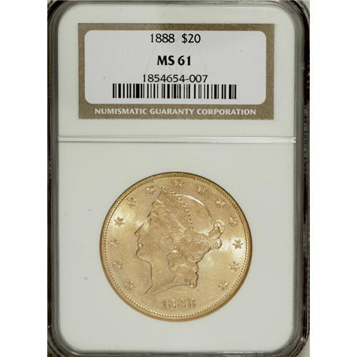 <B>1888 $20 MS61 NGC.</B></I> NGC Census: (328/123). PCGS Population (149/129). Mintage: 226,100. Numismedia Wsl. Price: $720. (#9008)<BR><BR><b>Shipping:</b> Coins & Currency (<a target="_blank" href="http://www.heritageauctions.com/common/shipping.php">view shipping information</a>)
