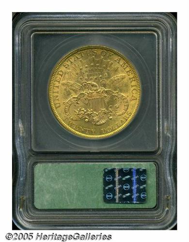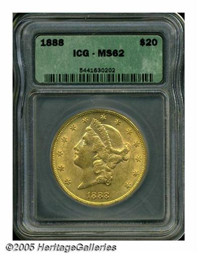 <B>1888<$20> MS62 ICG.</B></I> A fairly common item in the lower Uncirculated grades, and a good choice for type purposes. This piece has subdued surfaces and numerous small abrasions scattered over the obverse.