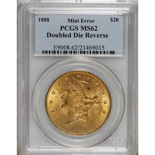 <B>1888 $20 MS62 PCGS.</B></I> FS-801. TWENTY DOLLARS and other reverse elements are noticeably die doubled. Unbroken luster shimmers across this pumpkin-gold and lime-green example. Small marks are distributed, along with a mark on the obverse rim at 1:30.<BR><BR><b>Shipping:</b> Coins & Currency (<a target="_blank" href="http://www.heritageauctions.com/common/shipping.php">view shipping information</a>)