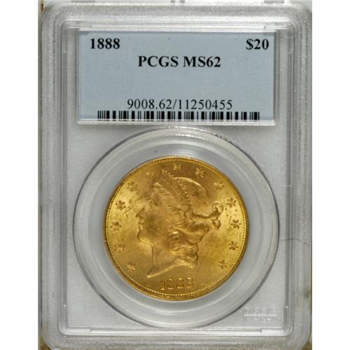 <B>1888 $20 MS62 PCGS.</B></I> Pervasive luster brightens this original apricot-gold better date double eagle. Well struck apart from the highpoints of the hair, and neither side has any singularly mentionable marks.<BR><BR><b>Shipping:</b> Coins & Currency (<a target="_blank" href="http://www.heritageauctions.com/common/shipping.php">view shipping information</a>)