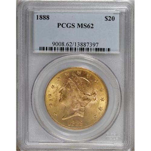<B>1888 $20 MS62 PCGS.</B></I> Well struck, with honey-gold surfaces that exude soft luster. A few small scuffs, especially on the obverse, limit the grade. This issue becomes scarce to rare in finer grades.<BR><BR><b>Shipping:</b> Coins & Currency (<a target="_blank" href="http://www.heritageauctions.com/common/shipping.php">view shipping information</a>)