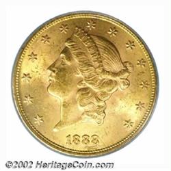 1888 $20 MS63 ICG. A scarce Type Three Double Eagle and seldom located in Uncirculated grades. Very seldom encountered in MS63 with only a dozen or so believed extant today with another dozen in higher grades. Sharply struck, the surfaces are satiny and show numerous small abrasions on each side, none of which are of individual significance. Important notice: We expect to be auctioning lots at the rate of 200-250 per hour. Sometimes eBay Premier live bid software cannot keep up with that pace, so we strongly recommend that you place a realistic proxy bid now as insurance to avoid disappointment. Also please note that all Heritage/CAA lots purchased through eBay Premier carry a 20% Buyer's Premium. Please make sure you read the Terms and Conditions.