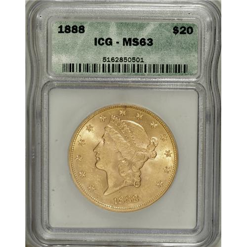 <B>1888 $20 MS63 ICG.</B></I> A scarce Type Three double eagle, seldom encountered in MS63, with only a couple of dozen or so believed extant today and another dozen-plus in higher grades. The sharply struck surfaces are satiny and show numerous small abrasions on each side, none of which are of individual significance.<BR><BR><b>Shipping:</b> Coins & Currency (<a target="_blank" href="http://www.heritageauctions.com/common/shipping.php">view shipping information</a>)