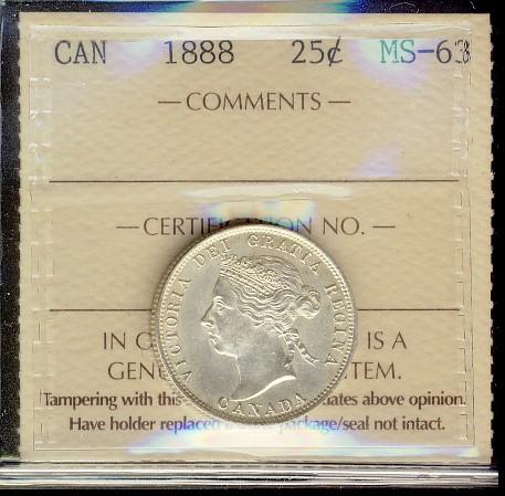 1888 25¢ ICCS MS63. Sparkling white issue with lots of lustre.