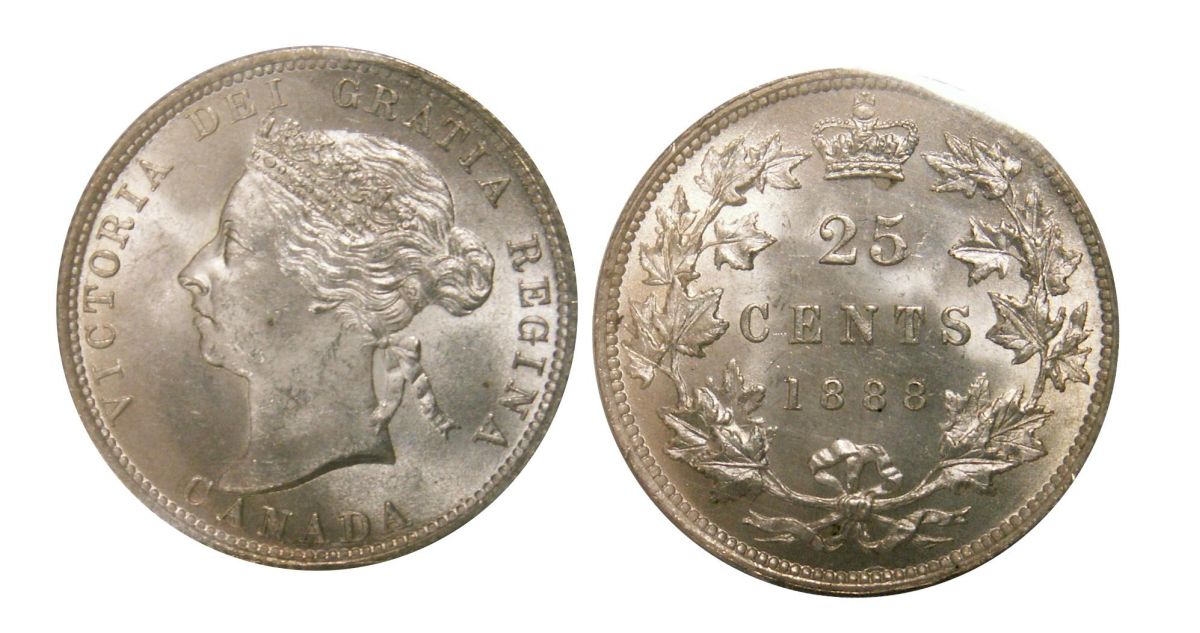 1888 25¢ ICCS MS65. Blast white and full lustre. SOLO highest graded by ICCS and none graded by PCGS.