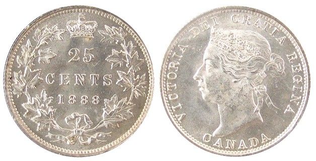 1888 25¢ ICCS MS65. Sparkling full white coin. Well struck with exceptional surfaces and clean fields. The coin has full original lustre. An absolute gem of a coin.