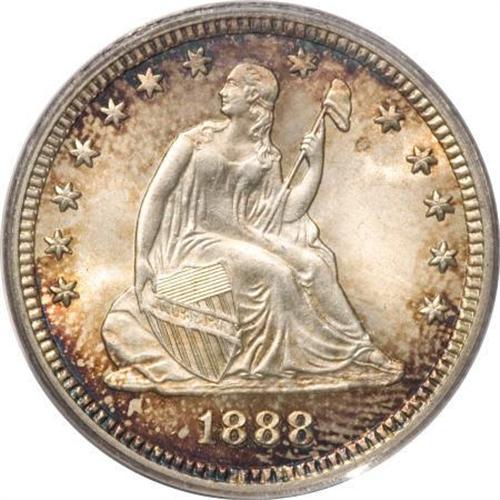 <B>1888 25C MS66 PCGS.</B></I> Electric-blue, purple, and russet patination concentrates at the borders of this Premium Gem, with the latter extending to the centers, more so on the reverse. A well executed strike brings out excellent definition on the design elements, except for some softness on the upper obverse. Devoid of significant marks. Population: 40 in 66, 10 finer (1/08).<BR><BR><B>Coin Engraver:</B> Christian Gobrecht<BR><BR><b>Shipping:</b> Coins & Currency (<a target="_blank" href="http://www.heritageauctions.com/common/shipping.php">view shipping information</a>)