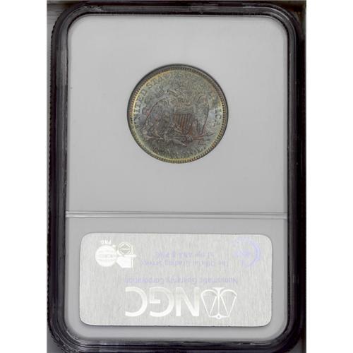 <B>1888<25C> MS67 <img border='0' src='http://www.heritagecoins.com/images/star.gif' width=10 height=10> NGC.</B></I> This amazing piece has frosty silver luster beneath pale gold, sea-green, and light blue color on the obverse, and lemon-yellow, teal, and violet color intermingled across the reverse. Nearly all of the design elements are boldly defined, except for Liberty's head and some of the stars. Census: 1 in 67 <img border='0' src='http://www.heritagecoins.com/images/star.gif' width=10 height=10>, 3 finer (9/06).