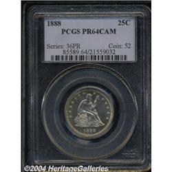 <B>1888<25C> PR64 Cameo PCGS.</B></I> Well struck, with mottled light brown toning on both sides. Wispy hairlines in the obverse fields limit the grade. Population: 6 in 64, 4 finer (3/04). <BR><BR><B>Important notice:</B> Heritage usually auctions material at the rate of 200-250 lots per hour. On some occasions eBay Live bid software or the Internet may not be able to keep up with the pace of the auction. We recommend placing a realistic absentee bid now as insurance to avoid disappointment. Occasionally the auctioneer may eliminate or reject an eBay Live bid, and the auctioneer may also reopen a lot after the close of the eBay live bidding (usually because we missed an audience bid), and may reject your bid even if it shows you as the winning bidder. By bidding via eBay Live, you agree that Heritage may award the lot to another bidder at its sole discretion under the circumstances described above or any other reasonable circumstances. Since eBay bids are not shown to us until we open the lot on the floor, we treat those bids just like floor bids. In most cases the floor responds before the eBay bid is presented to us, due to Internet lag time, so for consistency we have made it a policy that floor bids are always considered first over tie eBay live bids. Also please note that all Heritage lots purchased through eBay Live carry a 20% Buyer's Premium. Please make sure you read the Terms and Conditions before you bid.