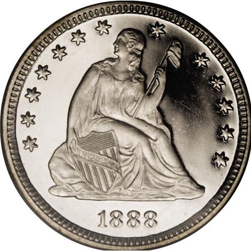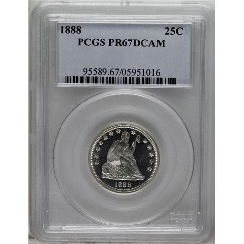 <B>1888 25C PR67 Deep Cameo PCGS.</B></I> In 1888, quarters were an afterthought, with a mere 10,000 circulation strikes minted in Philadelphia at a time when the Mint was obligated to produce large quantities of silver dollars. Proof coinage continued as normal during this period, with 832 quarters produced especially for sale to collectors. Of this proof mintage, it would be difficult to imagine a finer and more appealing specimen that the current coin, a blazing black and white beauty that appears as if it could have been minted yesterday. The mirrored surfaces are impossibly deep, and the strength of their contrast with the frosted devices merit PCGS' Deep Cameo designation, the only one assigned to any proof 1888 quarter in any grade by either major grading service. Any trace of toning appears to be well-hidden. A bit of striking weakness is visible in the obverse stars, and a few minor contact marks serve to limit the grade, but not the eye appeal. A small tick southeast of the second S in STATES might serve as a future pedigree identifier. The major grading services have seen fit to award higher grades to only two proof 1888 quarters, and neither of these coins bears any kind of Cameo designation.<BR><BR><b>Shipping:</b> Coins & Currency (<a target="_blank" href="http://www.heritageauctions.com/common/shipping.php">view shipping information</a>)