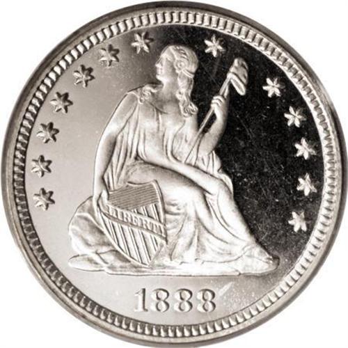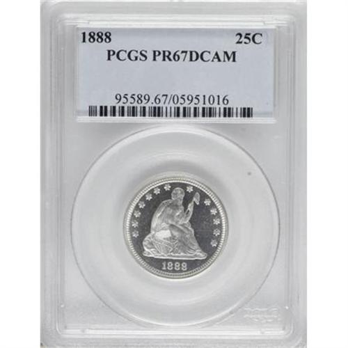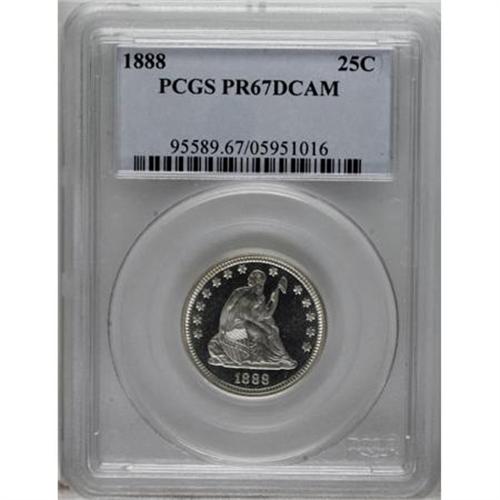 <B>1888 25C PR67 Deep Cameo PCGS.</B></I> In 1888, quarters were an afterthought, with a mere 10,000 circulation strikes minted in Philadelphia at a time when the Mint was obligated to produce large quantities of silver dollars. Proof coinage continued as normal during this period, with 832 quarters produced especially for sale to collectors. <BR> Of this proof mintage, it would be difficult to imagine a finer and more appealing specimen that the current coin, a blazing black and white beauty that appears as if it could have been minted yesterday. The mirrored surfaces are unbelievably deep, and the strength of their contrast with the frosted devices merit PCGS' Deep Cameo designation, the only one assigned to any proof 1888 quarter in any grade by either major grading service. Any trace of toning appears to be well-hidden. The design elements display crisp definition, though a bit of softness is visible in some of the obverse stars, and both sides are impeccably preserved; it would be difficult to even identify a pedigree marker. PCGS has seen fit to award higher grades to only two proof 1888 quarters, and neither of these coins bears any kind of Cameo designation (6/07).<BR><BR><b>Shipping:</b> Coins & Currency (<a target="_blank" href="http://www.heritageauctions.com/common/shipping.php">view shipping information</a>)