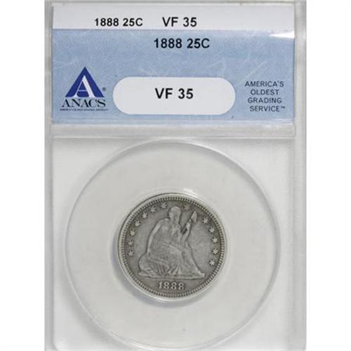 <B>1888 25C VF35 ANACS.</B></I> NGC Census: (1/102). PCGS Population (0/150). Mintage: 10,000. Numismedia Wsl. Price for NGC/PCGS coin in VF35: $318. (#5520)<BR><BR><B>Coin Engraver:</B> Christian Gobrecht<BR><BR><b>Shipping:</b> Coins & Currency (<a target="_blank" href="http://www.heritageauctions.com/common/shipping.php">view shipping information</a>)