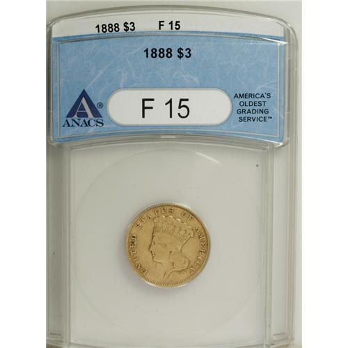 <B>1888 $3 F15 ANACS.</B></I> NGC Census: (2/846). PCGS Population (0/579). Mintage: 5,000. Numismedia Wsl. Price for NGC/PCGS coin in F15: $676. (#8010)<BR><BR><b>Shipping:</b> Coins & Currency (<a target="_blank" href="http://www.heritageauctions.com/common/shipping.php">view shipping information</a>)