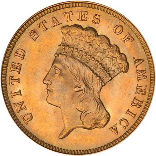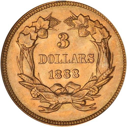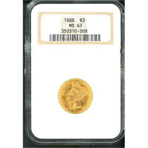 <b>1888 $3 Gold. NGC graded MS63.</b> Only 5,291 minted. Luxuriant orange-gold color is seen over each side with light accents of yellow gold. This date is easier said than done to find fully struck. The centers are bold but the lower wreath tends to slack off in detail at the ribbon bow <b>(PCGS # 8010)</b>