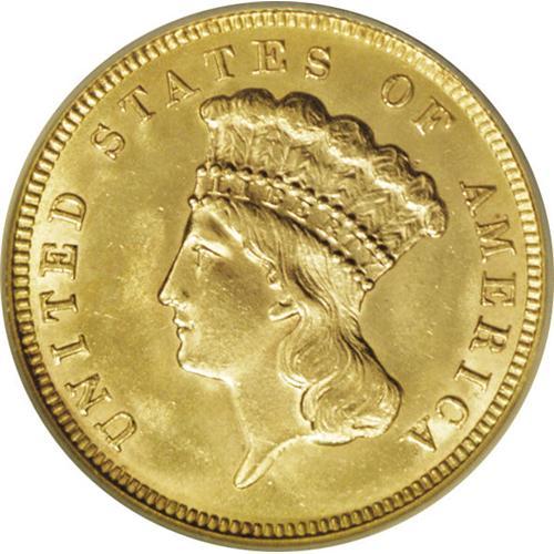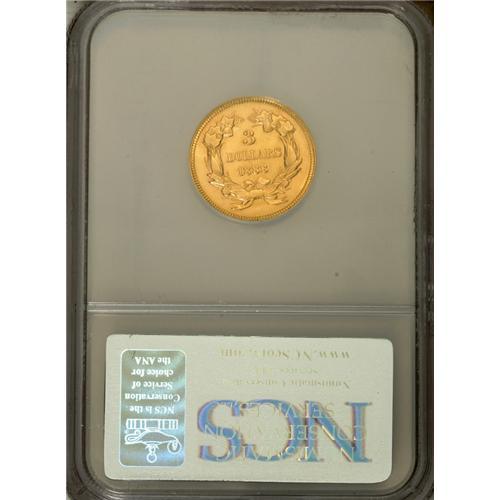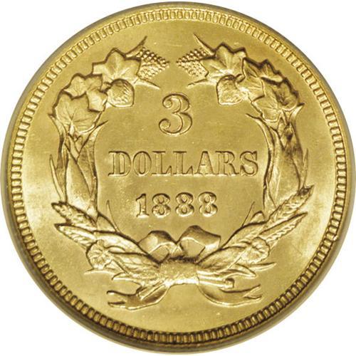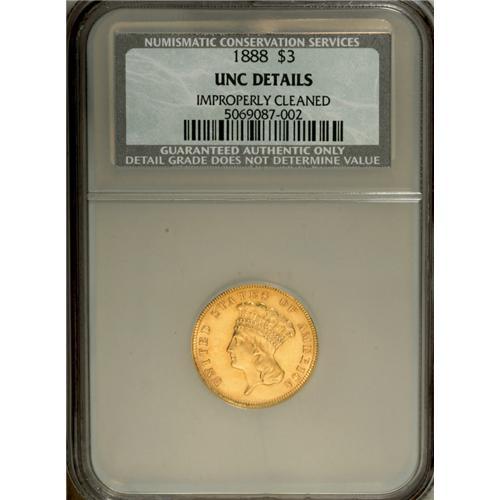 <B>1888 $3 --Improperly Cleaned--NCS. Unc Details.</B></I> This 1888 three dollar exhibits flashy bright yellow-gold surfaces that reveal a few stray, inoffensive hairlines scattered about. The design elements are well brought up; indeed, LIBERTY is bold, as are the remaining letters and numerals on both sides. Despite the NCS disclaimer, this is an attractive, acceptable coin that should not scare the prospective bidder away.<BR><BR><b>Shipping:</b> Coin/Currency (<a target="_blank" href="http://www.heritageauctions.com/common/shipping.php">view shipping information</a>)