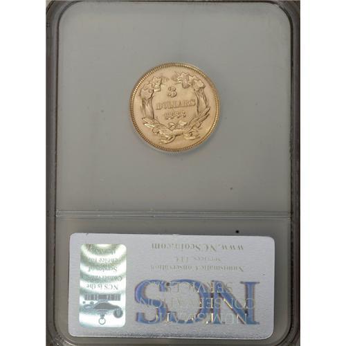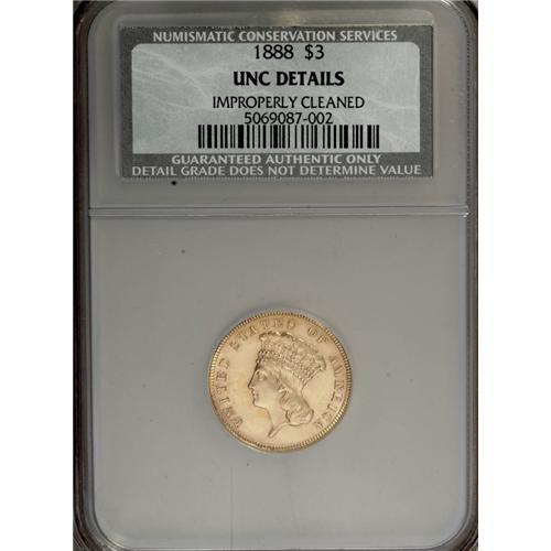 <B>1888 $3 --Improperly Cleaned--NCS. Unc Details.</B></I> This 1888 three dollar exhibits flashy bright yellow-gold surfaces that reveal a few stray, inoffensive hairlines scattered about. Solidly struck with a reasonable appearance, far better than the NCS warning would suggest.<BR><BR><b>Shipping:</b> Coins & Currency (<a target="_blank" href="http://www.heritageauctions.com/common/shipping.php">view shipping information</a>)