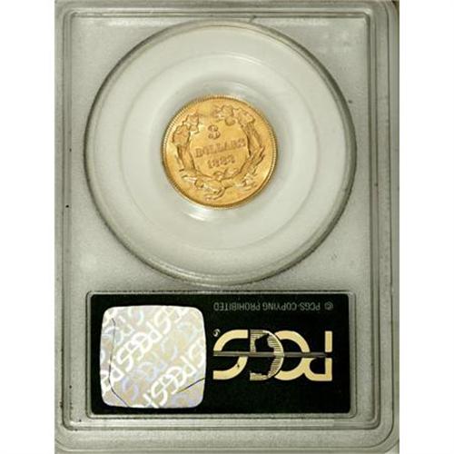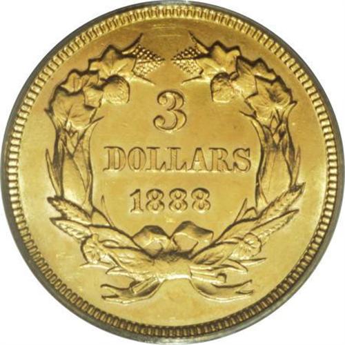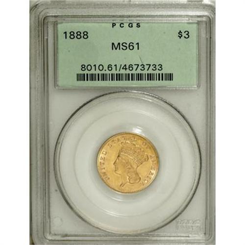<B>1888 $3 MS61 PCGS.</B></I> The net distribution of 1888 three dollar gold coins may have been less than the 5,000 business strikes minted, per a comment by numismatist S.H. Chapman: "Of the later years of the $3, large numbers were remelted at the Philadelphia Mint." A sharp strike emboldens the design features of this lustrous apricot-gold MS61 example. A small linear mark on Liberty's jaw and wispy handling marks in the fields preclude a higher grade. Housed in a green-label holder.<BR><I>From The Vanek Collection.</B></I><BR><BR><b>Shipping:</b> Coins & Currency (<a target="_blank" href="http://www.heritageauctions.com/common/shipping.php">view shipping information</a>)