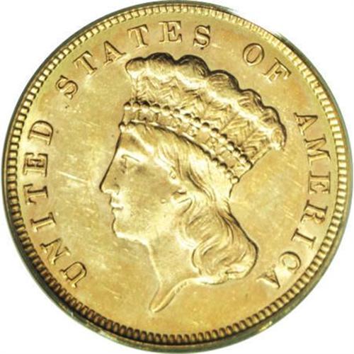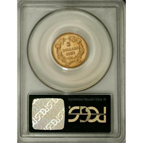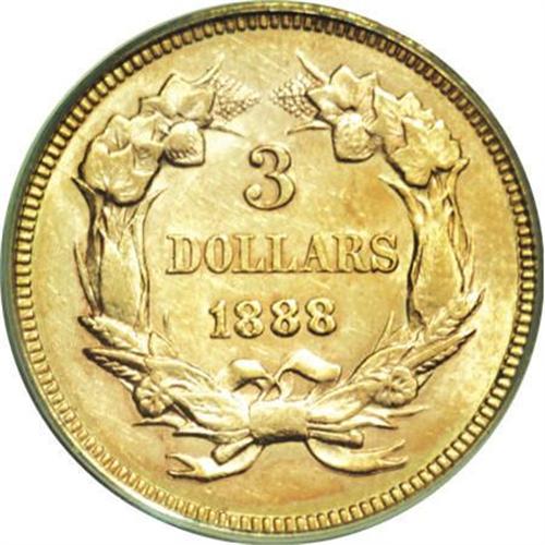 <B>1888 $3 MS61 PCGS.</B></I> The beautiful surfaces boast areas of reddish-gold, greenish-gold, and hazel, an unusual but delightful color palette. The coin shows much luster, but the surfaces show light field chatter on both sides consistent with the grade. There are no singular abrasions, however, and the strike is pleasing. The reverse die is rotated slightly with respect to the obverse. Certified in a green-label holder. <BR><BR><B>Coin Engraver:</B> James B. Longacre<BR><BR><b>Shipping:</b> Coins & Currency (<a target="_blank" href="http://www.heritageauctions.com/common/shipping.php">view shipping information</a>)