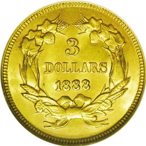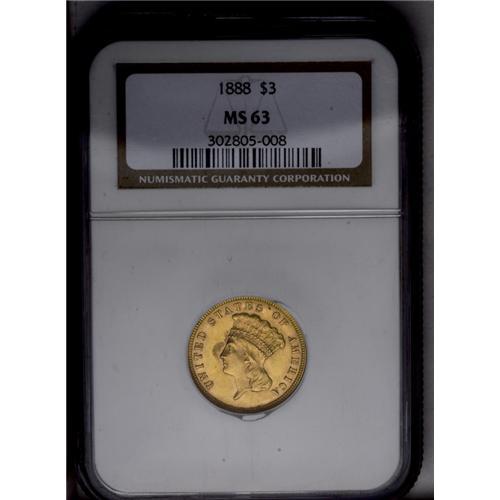 <B>1888<$3> MS63 NGC.</B></I> This coin is highly lustrous and shows lovely, deep green-gold and pink-orange color. Well struck, the surfaces are minimally abraded for the assigned grade level, with no singly important marks on either side.