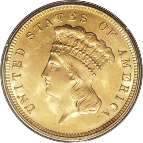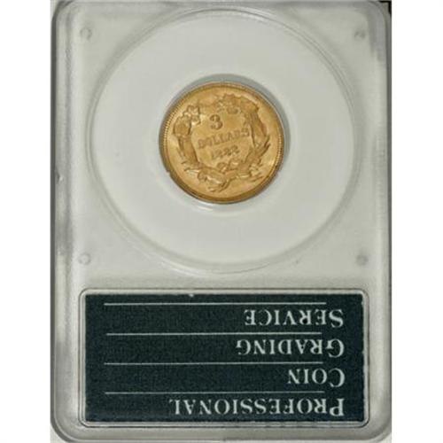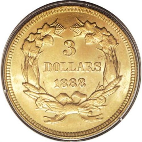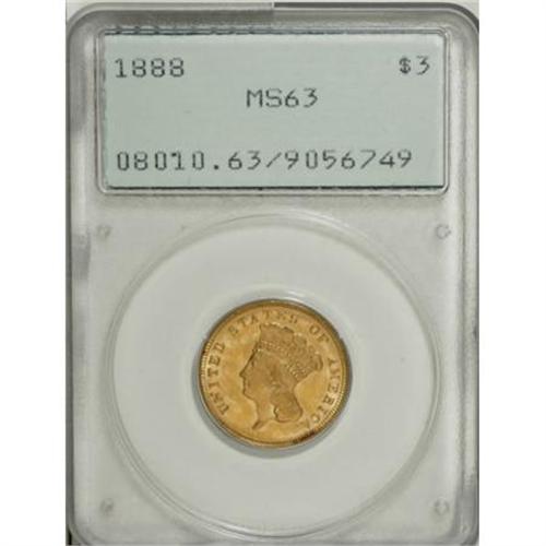 <B>1888 $3 MS63 PCGS.</B></I> An impressively smooth and lustrous example of this penultimate date. UNITED is die doubled, diagnostic of the business strike issue. Only 5,000 pieces were struck, although Philadelphia numismatists of the day managed to set a number of those aside. Encapsulated in a first generation holder.<BR><BR><B>Coin Engraver:</B> James B. Longacre<BR><BR><b>Shipping:</b> Coins & Currency (<a target="_blank" href="http://www.heritageauctions.com/common/shipping.php">view shipping information</a>\)