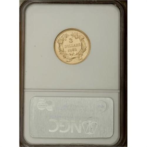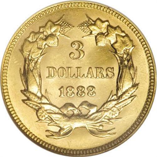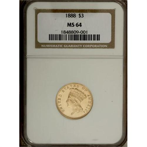 <B>1888 $3 MS64 NGC.</B></I> This issue represents an unusual numismatic situation. The mintage was just 5,000 coins, lower than 17 of the 40 business strike issues in the three dollar series. However, its total NGC population of 425 coins in all grades is only lower than eight out of 40 issues. Mint State examples of this issue are not difficult to locate, even in Choice or Gem condition. This sharply struck example has satiny yellow-gold luster with slightly reflective fields. While some deeply mirrored Mint State pieces have been confused with proofs, this example has frosty luster, an obvious business strike.<BR><BR><B>Coin Engraver:</B> James B. Longacre<BR><BR><b>Shipping:</b> Coins & Currency (<a target="_blank" href="http://www.heritageauctions.com/common/shipping.php">view shipping information</a>)