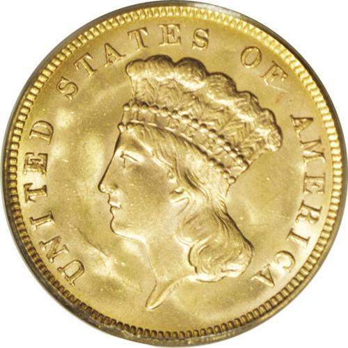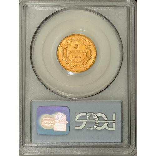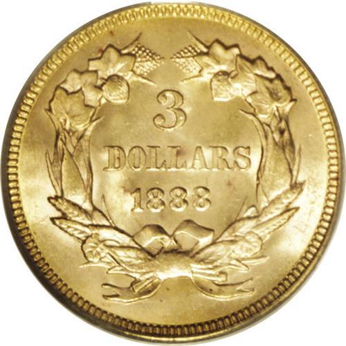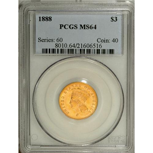 <B>1888 $3 MS64 PCGS.</B></I> A sharp and lustrous example of this date from late in the life of this popular series. The reverse is distraction-free save for a small copper alloy spot to the right of the second L in DOLLARS. The obverse shows a light scrape in the left (facing) field and on the Indian's cheek under a loupe, again undistracting but limiting a Gem grade. Nonetheless a pretty coin.<BR><BR><b>Shipping:</b> Coin/Currency (<a target="_blank" href="http://www.heritageauctions.com/common/shipping.php">view shipping information</a>)