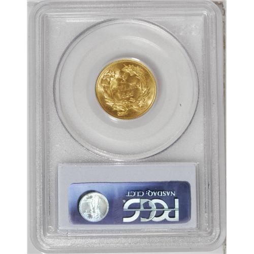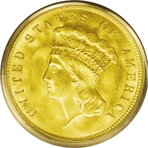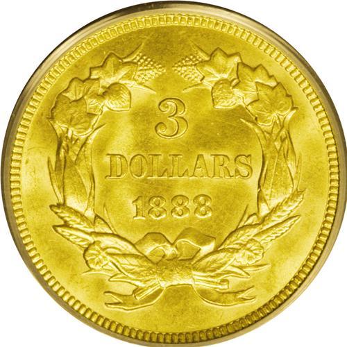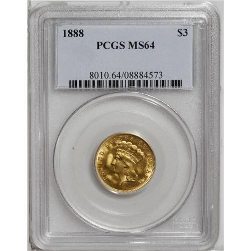<B>1888<$3> MS64 PCGS.</B></I> Stunning apricot-gold surfaces are incredibly frosty, lustrous, and appealing, with tinges of hazel near the peripheries on each side. Some light doubling can be seen at the tops of UNITED. This strictly original near-Gem not only appears quite high-end compared to the typical MS64 piece of this issue, but it also offers enormous eye appeal. Only two minute ticks in the right obverse field, visible under a loupe, and a small, undistracting scrape on Liberty's cheek seemingly limit a Gem grade. With Gem pieces breaking through the $25,000 level, an astute numismatist may recognize this piece as a significant opportunity to both acquire a beautiful coin and to save some money in the process.