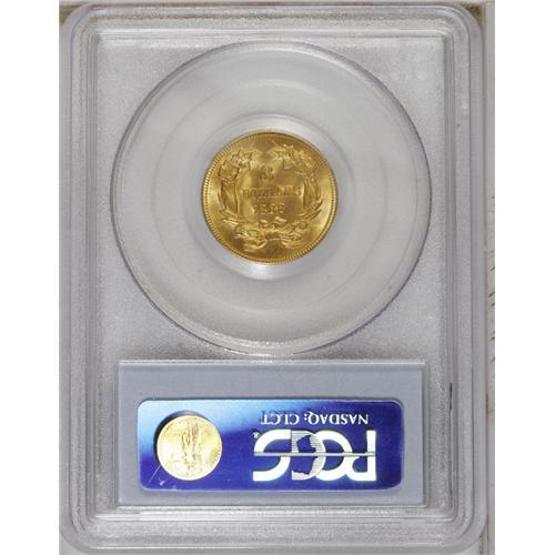 <B>1888 $3 MS64 PCGS.</B></I> Well struck with especially fine details noted on the obverse, this near-Gem also displays shimmering luster and lovely orange-gold coloration. Broad doubling is noted along the tops of UNITE. No individually noteworthy marks are found on either side, and only wispy field blemishes seemingly preclude an even finer grade assessment.<BR><BR><b>Shipping:</b> Coin/Currency (<a target="_blank" href="http://www.heritageauctions.com/common/shipping.php">view shipping information</a>)