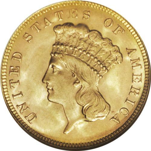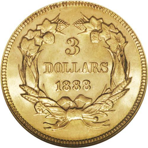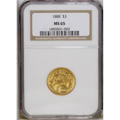<B>1888 $3 MS65 NGC.</B></I> The few active collectors of gold coins in the late 1880s must have had quite a heyday, as the writing had been on the wall for several years that the three dollar gold pieces would go the way of the woolly mammoth. After 1879 the yearly mintages never again exceeded 7,000 pieces, yet many of the later pieces were saved for posterity. According to Bowers' <I>The United States $3 Gold Pieces 1854-1889</B></I> (2005), New York City-based coin dealer J.W. Scott apparently bought several hundred examples of the 1888 issue directly from the Mint.<BR> The present example, like most of its brethren, shows an "aura" of reflectivity around the central portrait. Excellent luster and pretty apricot-gold surfaces complete the attractive package. The reverse die is rotated about 30 degrees counterclockwise. Census: 36 in 65, 13 finer (11/06).<BR><BR><b>Shipping:</b> Coin/Currency (<a target="_blank" href="http://www.heritageauctions.com/common/shipping.php">view shipping information</a>)