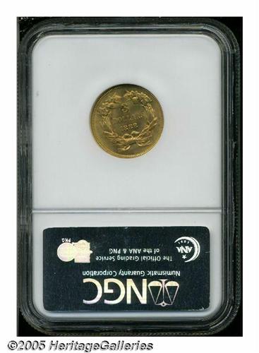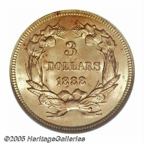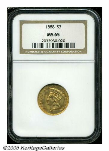 <B>1888<$3> MS65 NGC.</B></I> This is a frosty Gem with bright yellow-gold luster and splashes of coppery toning. An outstanding opportunity for the advanced date collector, and for the type collector as well. The appearance of this example is typical of nearly all survivors from the original 5,000 coin mintage, with frosty luster rather than the prooflike appearance of most other dates in the final decade of the denomination. Many examples of this date survive today, due to extensive hoarding at or near the time of issue. Most are in lower grades with very few finer coins known today. Population: 37 in 65, 7 finer (5/05).<BR><I>From The Clifford Columbus Collection.</B></I>
