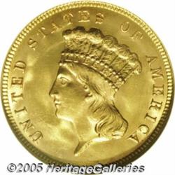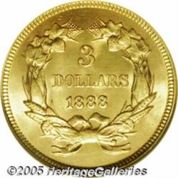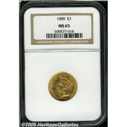 <B>1888 $3 MS65 NGC.</B></I> Unlike most other late-date Three Dollar gold issues, the 1888 rarely shows prooflike fields or prooflikeness combined with mint frost. This Gem example, one of just 5,000 business strikes produced, is fully frosted and has swirling cartwheel luster that is hardly affected by even the slightest signs of coin-to-coin contact. The strike is short of full, but quite strong overall and delicate orange patina frames each side.