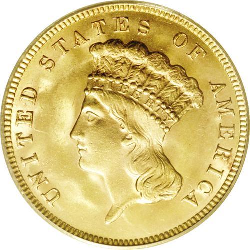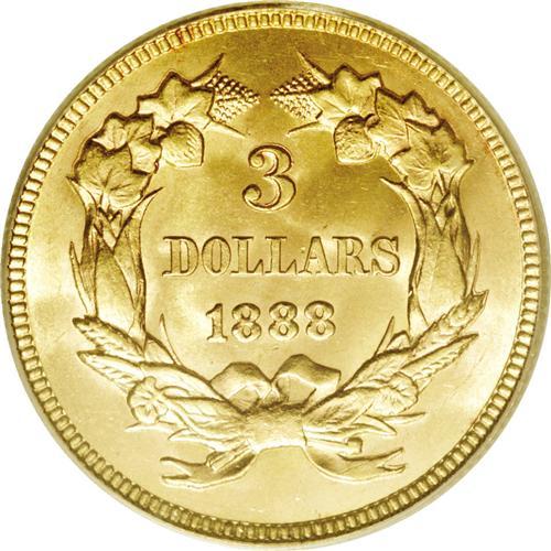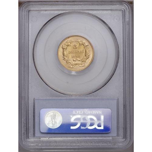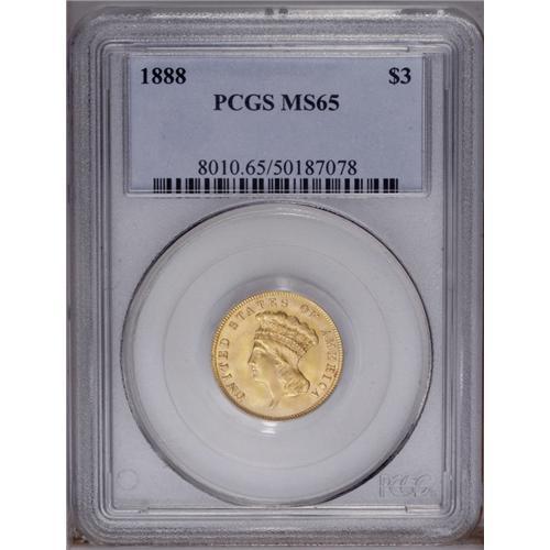 <B>1888<$3> MS65 PCGS.</B></I> Numismatic scholars estimate that no more than 500 pieces of the 1888 three dollar gold survive out of a paltry original mintage of 5,000 business strikes. While many of these coins fall into the Mint State category, most display poor luster and/or excessive bagmarks that confine them to the lower Mint State levels. In MS65, the 1888 is definitely scarce and, in terms of eye appeal alone, the present example probably betters most of its similarly graded brethren. Gorgeous peach-gold coloration blankets both sides, but the frosty luster is readily appreciable at all angles. Free of criticism, the strike elicits bold definition. Typically pristine for the grade, this coin should attract significant bids from advanced gold specialists. Population: 68 in 65, 25 finer (1/06).