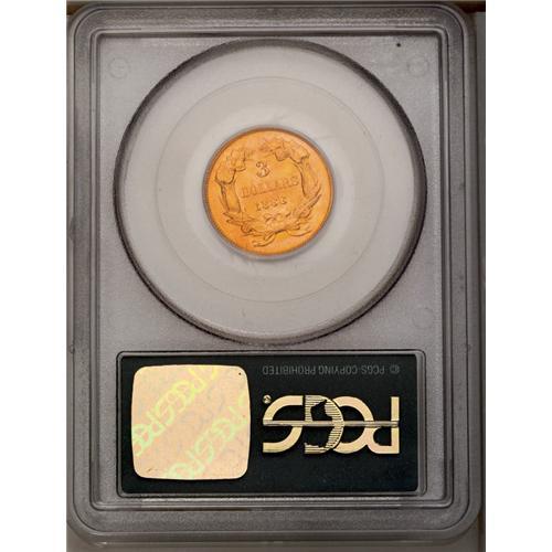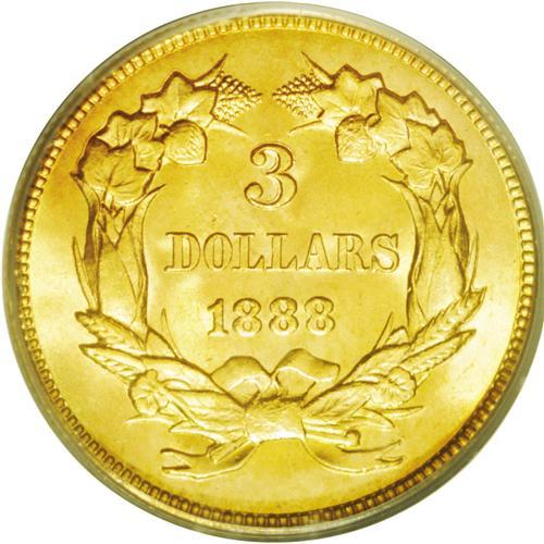 <B>1888<$3> MS66 PCGS.</B></I> The 1888 is another low mintage entry in this popular series. Only 5,000 business strikes were produced, along with 291 proofs. A small number of Uncirculated pieces were set aside by well-placed contemporary numismatists, but these are mostly distributed, in bell curve fashion, between the MS62 and MS65 grades. The present lustrous orange-gold Premium Gem has a virtually pristine reverse, and the portrait is also remarkably clean. As often seen on the 1888, UNITED is strongly die doubled toward the rim, and Liberty has an "Alligator Eye" similar to that encountered on certain 1887 silver dollars. Encapsulated in a green label PCGS holder. Population: 24 in 66, 2 finer (5/06).