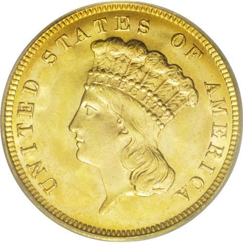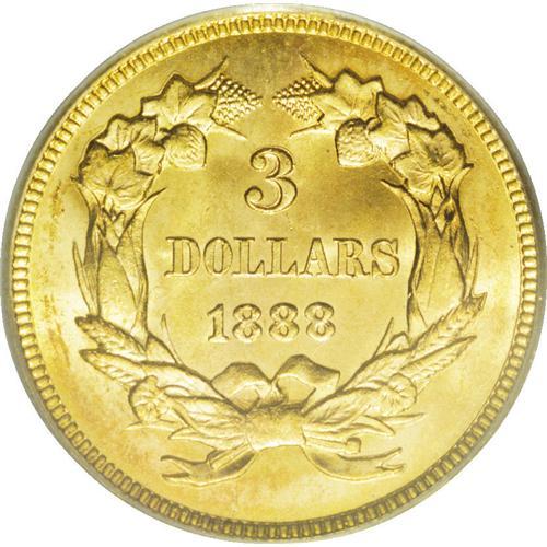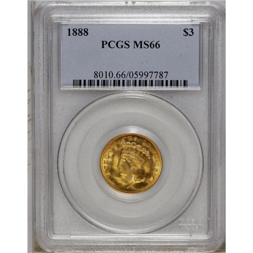 <B>1888 $3 MS66 PCGS.</B></I> The 1888 is one of many issues within the three dollar series with enticingly low mintages. Only 5,000 pieces were struck, which, if put into perspective, is only 5% of the mintage of the 1893-S dollar. It is true that the 1888 circulated little, since survivors are more often found in Mint State than in worn condition. It is also true that the majority of the issue has likely been melted, since the combined NGC and PCGS population is less than 1,000 pieces, which undoubtedly includes a large number of resubmissions over the past twenty years. The MS62 to MS64 grades account for a sizeable portion of Uncirculated 1888 examples. Gems are scarce, and Premium Gems are rare. Speculators often gravitate toward the 1888 because of its low mintage, which is only about 6% of the 1878 type coin. Yet the 1888 trades for only a small premium above type prices. Shrewd gold type collectors often select the 1888, since it provides greater value than the 'common' 1878.<BR> This splendid representative possesses rich apricot toning that is deepest across the open fields. The strike is penetrating, even on the plumes of the headdress and the knot of the bow, which are sometimes mushy on this denomination. As one would expect from the MS66 grade, Liberty's cheek is refreshingly unabraded, and the obverse field is also clean. On the reverse, contact is minimal aside from a couple of minor grazes relegated to the periphery near 9 o'clock. UNITED is strongly die doubled, a diagnostic for business strikes of the date. This lustrous Premium Gem would make a suitable contribution to a high grade gold type set, and would also set a lofty standard for a date collection of the series. Population: 26 in 66, 2 finer (10/06).<BR><BR><b>Shipping:</b> Coin/Currency (<a target="_blank" href="http://www.heritageauctions.com/common/shipping.php">view shipping information</a>)