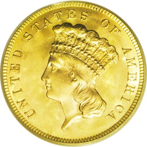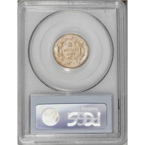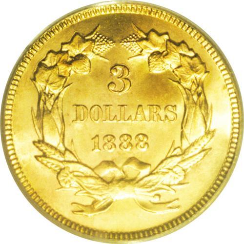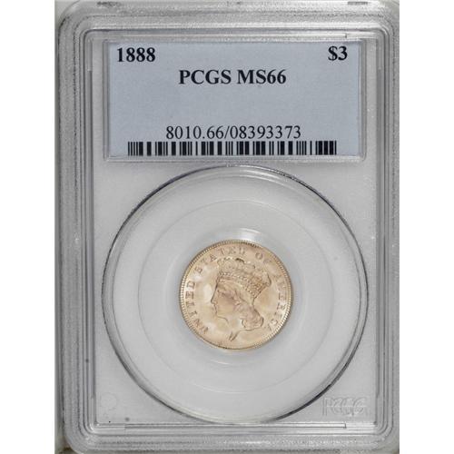 <B>1888<$3> MS66 PCGS.</B></I> This is an exceptional example of the date. Even though 1888 threes are not rare in Mint State grades, they are seldom encountered at the highest grade levels. In fact, the PCGS population data shows that only two finer pieces have been certified. This example has vibrant pinkish-gold color with frosty luster on both sides. All of the design elements are boldly defined with the sole exception of the ribbon bow on the reverse. All business strikes of this date were coined from a doubled obverse die, with doubling visible at the tops of UNITED. Population: 26 in 66, 2 finer (9/06).