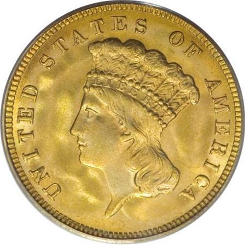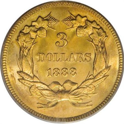 <B>1888 $3 MS66 PCGS.</B></I> The 1888 is one of many issues within the three dollar series with enticingly low mintages. Only 5,000 pieces were struck, which, if put into perspective, is only 5% of the mintage of the 1893-S dollar. It is true that the 1888 circulated little, since survivors are more often found in Mint State than in worn condition. It is also true that the majority of the issue has likely been melted, since the combined NGC and PCGS population is less than 1,000 pieces, which undoubtedly includes a large number of resubmissions over the past 20 years. The MS62 to MS64 grades account for a sizeable portion of Uncirculated 1888 examples. Gems are scarce, and Premium Gems are rare. Speculators often gravitate toward the 1888 because of its low mintage, which is only about 6% of the 1878 type coin. Yet the 1888 trades for only a small premium above type prices. Shrewd gold type collectors often select the 1888, since it provides greater value than the "common" 1878.<BR> This splendid representative possesses rich apricot toning that is deepest across the open fields. The strike is penetrating, even on the plumes of the headdress and the knot of the bow, which are sometimes mushy on this denomination. As one would expect from the MS66 grade, Liberty's cheek is refreshingly unabraded, and the obverse field is also clean. On the reverse, contact is minimal aside from a couple of minor grazes relegated to the periphery near 9 o'clock. UNITED is strongly die doubled, a diagnostic for business strikes of the date. This lustrous Premium Gem would make a suitable contribution to a high grade gold type set, and would also set a lofty standard for a date collection of the series. Population: 26 in 66, 2 finer (4/07). <BR><BR><b>Shipping:</b> Coins & Currency (<a target="_blank" href="http://www.heritageauctions.com/common/shipping.php">view shipping information</a>)