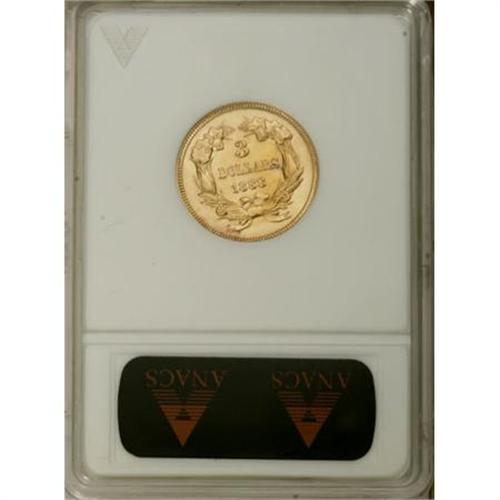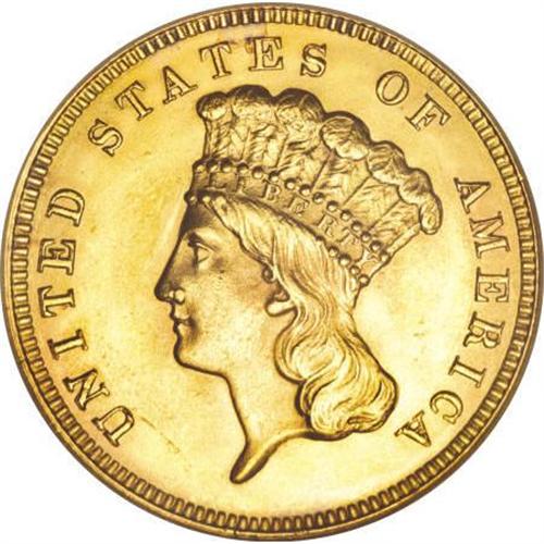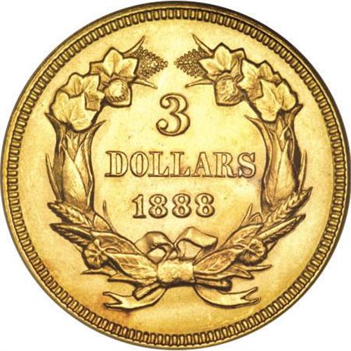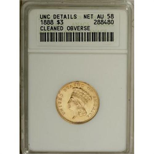 <B>1888 $3 --Cleaned Obverse--ANACS. Unc. Details, Net AU58.</B></I> Patient rotation beneath a loupe eventually reveals faint horizontal hairlines near the date and STATES. Lustrous and alertly struck with a blush of peach patina on the central reverse. UNITED is die doubled, as usual for business strikes of this ultra-low mintage date. Just 5,000 pieces were issued, although well-connected Philadelphia dealers appear to have set a number aside for posterity.<BR><BR><B>Coin Engraver:</B> James B. Longacre<BR><BR><b>Shipping:</b> Coins & Currency (<a target="_blank" href="http://www.heritageauctions.com/common/shipping.php">view shipping information</a>)