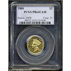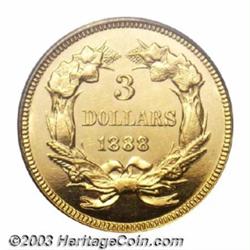 <table><tr><td><TABLE cellSpacing=0 cellPadding=0 width="100%" bgColor=#000000 border=0><TBODY> <TR><TD width="100%"><TABLE cellSpacing=1 cellPadding=3 width="100%" border=0><TBODY><TR><TD width="100%" bgColor=#79735c><FONT face=arial color=#ffffff size=3><B>Description</B> </FONT></TD></TR><TR><TD width="100%" bgColor=#ffffff><FONT face=arial size=2><B>1888 $3 PR63 Cameo PCGS.</B></I> The 1888 is the most frequently encountered date among proof Three Dollar Gold Pieces with 291 pieces struck and an estimated 65 pieces believed extant today in all grades. However, examples in this grade and with this degree of contrast can be considered very scarce. The fields are quite deep in their mirrored reflectivity and show the orange-peel effect that is commonly encountered on proof gold coins from this era. The devices show a reasonable amount of mint frost, and when set against the depth of mirrored reflectivity, in the fields presents a pleasing cameo contrast. Identifiable by a small area of die rust (as struck) under the CA of AMERICA.<BR><I>From The New Millennium Collection.</B></I> </FONT></TD></TR></TBODY></TABLE></TD></TR></TBODY></TABLE><BR><A name=PricesRealized></A><TABLE cellSpacing=0 cellPadding=0 width="100%" bgColor=#000000 border=0><TBODY><TR><TD width="100%"><TABLE cellSpacing=1 cellPadding=3 width="100%" border=0><TBODY><TR><TD width="100%" bgColor=#79735c><A name=PR><FONT face=arial color=#ffffff size=3><B>Previous Prices from Heritage Auctions</B> </FONT></A></TD></TR><TR><TD bgColor=#f6f6ed>No Prior Data Recorded </TD></TR><TR><TD bgColor=#ffffff><FONT face=arial size=1 ?>PLEASE NOTE: All prices realized reflect the final hammer price PLUS the buyer's premium in auctions that charge a buyer's premium. Each item has a notation at the top of the listing indicating whether that lot included a buyer's premium. Example: A item that sells with a final hammer price of $100 and a 20% buyer's premium will display with a price realized of $120. All information listed is intended to be as accurate as possible, but errors are possible. Please use this guide carefully and inform us of any inaccuracies. </FONT></TD></TR></TBODY></TABLE></TD></TR></TBODY></TABLE><BR><TABLE cellSpacing=0 cellPadding=0 width="100%" bgColor=#000000 border=0><TBODY><TR><TD width="100%"><TABLE cellSpacing=1 cellPadding=3 width="100%" border=0><TBODY><TR><TD width="100%" bgColor=#79735c colSpan=6><FONT face=arial color=#ffffff size=3><B>Price Guide*</B> </FONT></TD></TR><TR bgColor=#f6f6ed><TD align=middle><B>Grade</B> </TD><TD align=middle><B>Coin World<BR>(Trends)</B> </TD><TD align=middle><B>Numismedia<BR>Retail</B> </TD><TD align=middle><B>Numismedia<BR>Wholesale</B> </TD><TD align=middle><B>Coin<BR>Universe</B> </TD><TD align=middle><B>Heritage<BR>Value Index</B> </TD></TR><TR bgColor=#ffffff><TD align=middle>62</TD><TD align=right>---</TD><TD align=right>---</TD><TD align=right>---</TD><TD align=right>---</TD><TD align=right>$5,640.00</TD></TR><TR style="FONT-WEIGHT: bold" bgColor=#cccfdd><TD align=middle>63</TD><TD align=right>---</TD><TD align=right>---</TD><TD align=right>---</TD><TD align=right>---</TD><TD align=right>$7,200.00</TD></TR><TR bgColor=#ffffff><TD align=middle>64</TD><TD align=right>---</TD><TD align=right>---</TD><TD align=right>---</TD><TD align=right>---</TD><TD align=right>$9,000.00</TD></TR><TR bgColor=#ffffff><TD colSpan=6><FONT size=1>*All information listed is intended to be as accurate as possible, but errors are possible. No item may be returned or refused based on this information which is provided as a service to our customers. You should contact each pricing source directly to determine the accuracy of this information. </FONT></TD></TR></TBODY></TABLE></TD></TR></TBODY></TABLE><BR><TABLE cellSpacing=0 cellPadding=0 width="100%" bgColor=#000000 border=0><TBODY><TR><TD width="100%"><TABLE cellSpacing=1 cellPadding=3 width="100%" border=0><TBODY><TR><TD width="100%" bgColor=#79735c><FONT face=arial color=#ffffff size=3><B>Population Guide</B> </FONT></TD></TR><TR bgColor=#ffffff><TD align=middle><!-- Begin Output of Population Grid--><TABLE cellSpacing=0 cellPadding=0 width="100%" border=0><TBODY><TR><TD vAlign=center><TABLE cellSpacing=0 width="100%" border=1 cellsadding="3"><TBODY><TR><TD vAlign=center><TABLE cellSpacing=0 cellPadding=3 width="100%" border=1><TBODY><TR><TD vAlign=center align=middle bgColor=#f0f1e8 colSpan=2 <CENTER><FONT face=Arial size=2><B>PCGS Pop </B></FONT><CENTER></CENTER></TD><TD vAlign=center align=middle bgColor=#f0f1e8 colSpan=2><CENTER><FONT face=Arial size=2><B>NGC Pop</B></CENTER></FONT></TD></TR><TR><TD vAlign=center><FONT face=Arial size=2>(63)</FONT> </TD><TD vAlign=center align=right><FONT face=Arial size=2>4</FONT> </TD><TD vAlign=center><FONT face=Arial size=2>(63)</FONT> </TD><TD vAlign=center align=right><FONT face=Arial size=2>4</FONT> </TD></TR><TR><TD vAlign=center><FONT face=Arial size=2>(>63)</FONT> </TD><TD vAlign=center align=right><FONT face=Arial size=2>6</FONT> </TD><TD vAlign=center><FONT face=Arial size=2>(>63)</FONT> </TD><TD vAlign=center align=right><FONT face=Arial size=2>61</FONT> </TD></TR></TBODY></TABLE></TD></TR></TBODY></TABLE></TD></TR></TBODY></TABLE><!-- End Output of Population Grid--></TD></TR></TBODY></TABLE></TD></TR></TBODY></TABLE><BR><TABLE cellSpacing=0 cellPadding=0 width="100%" bgColor=#000000 border=0><TBODY><TR> Important notice: Heritage usually auctions material at the rate of 200-250 lots per hour. On some occasions eBay Live bid software or the Internet may not be able to keep up with the pace of the auction. We recommend placing a realistic absentee bid now as insurance to avoid disappointment. Occasionally the auctioneer may eliminate or reject an eBay Live bid, and the auctioneer may also reopen a lot after the close of the eBay live bidding (usually because we missed an audience bid), and may reject your bid even if it shows you as the winning bidder. By bidding via eBay Live, you agree that H