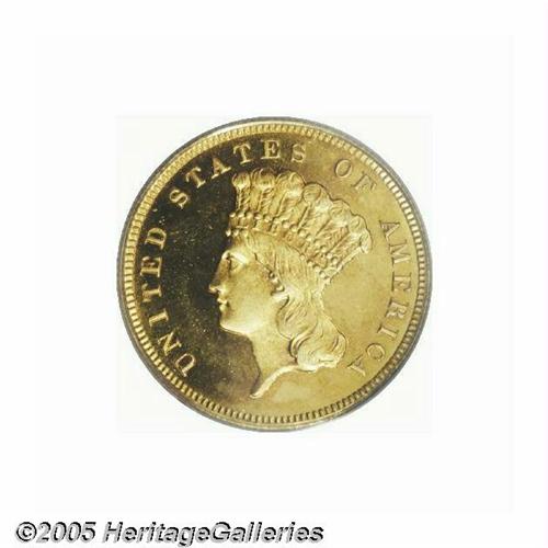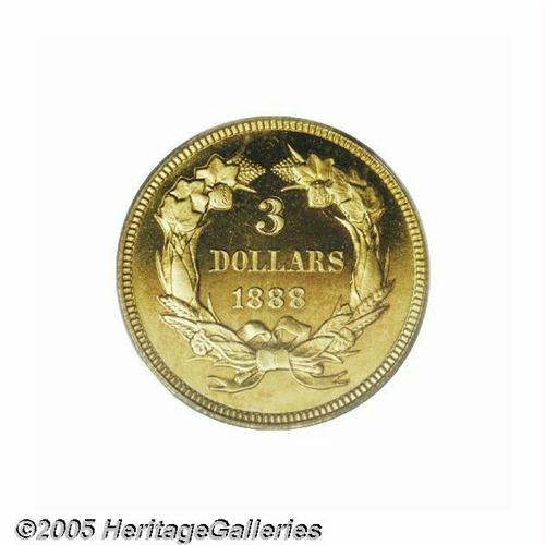 <B>1888<$3> PR66 Deep Cameo PCGS.</B></I> This coin is very likely the finest known 1888 Proof to survive which shows the elusive Deep Cameo contrast. It is the only example graded this high by PCGS and NGC hasn't graded any in their Ultra Cameo designation of this date. In fact, PCGS has graded two examples of this issue that show the full Deep Cameo contrast, this coin and another as PR65. The color can best be described as rich orange-gold, as vibrant as any seen on any proof gold coin. Examination of the surfaces finds the expected orange-peel fields in abundance. This particular coin is identifiable by a minute lintmark just left of the lower knob on the 3, and by a tiny tick in the field left of the L in LIBERTY. There is diagnostic minor die rust present on the upper portion of Liberty's neck, and this is present on all Proof Three dollar gold pieces issued in 1888. For the specialist, obtaining this coin would represent a wonderful opportunity. This coin is accompanied by the following letter from Scott Travers, who is similarly taken with the ample charms of this regal Gem proof.<BR>"It is by far the most flawless, awe-inspiring, and aesthetically appealing three dollar gold piece I have ever seen or handled in my career. I can't imagine any other coin of this type being as spectacular. Dramatic cameo contrast between the golden-pond-like fields and deeply frosted devices combine to make this example particularly alluring." Scott Travers of Scott Travers Rare Coin Galleries (letter to accompany)