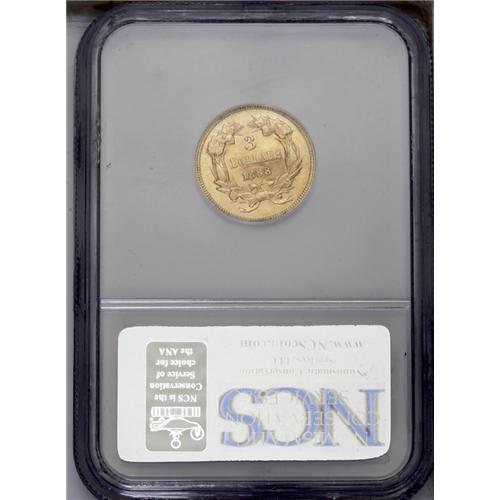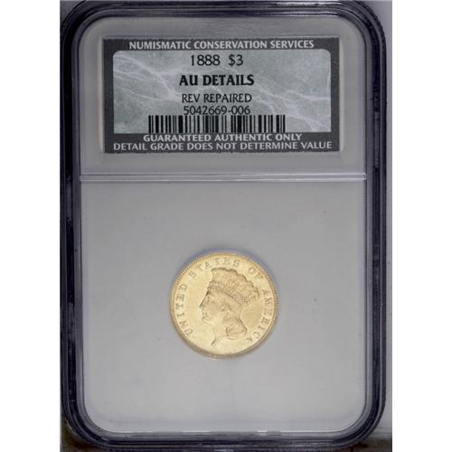 <B>1888 $3 --Reverse Repaired--NCS. AU Details.</B></I> Crudely tooled on the field near the final 8 in the date. However, the piece is an 1888, since UNITED is die doubled, the diagnostic for business strikes of the date. The reverse is also hairlined. The obverse has a pleasing, briefly circulated appearance.